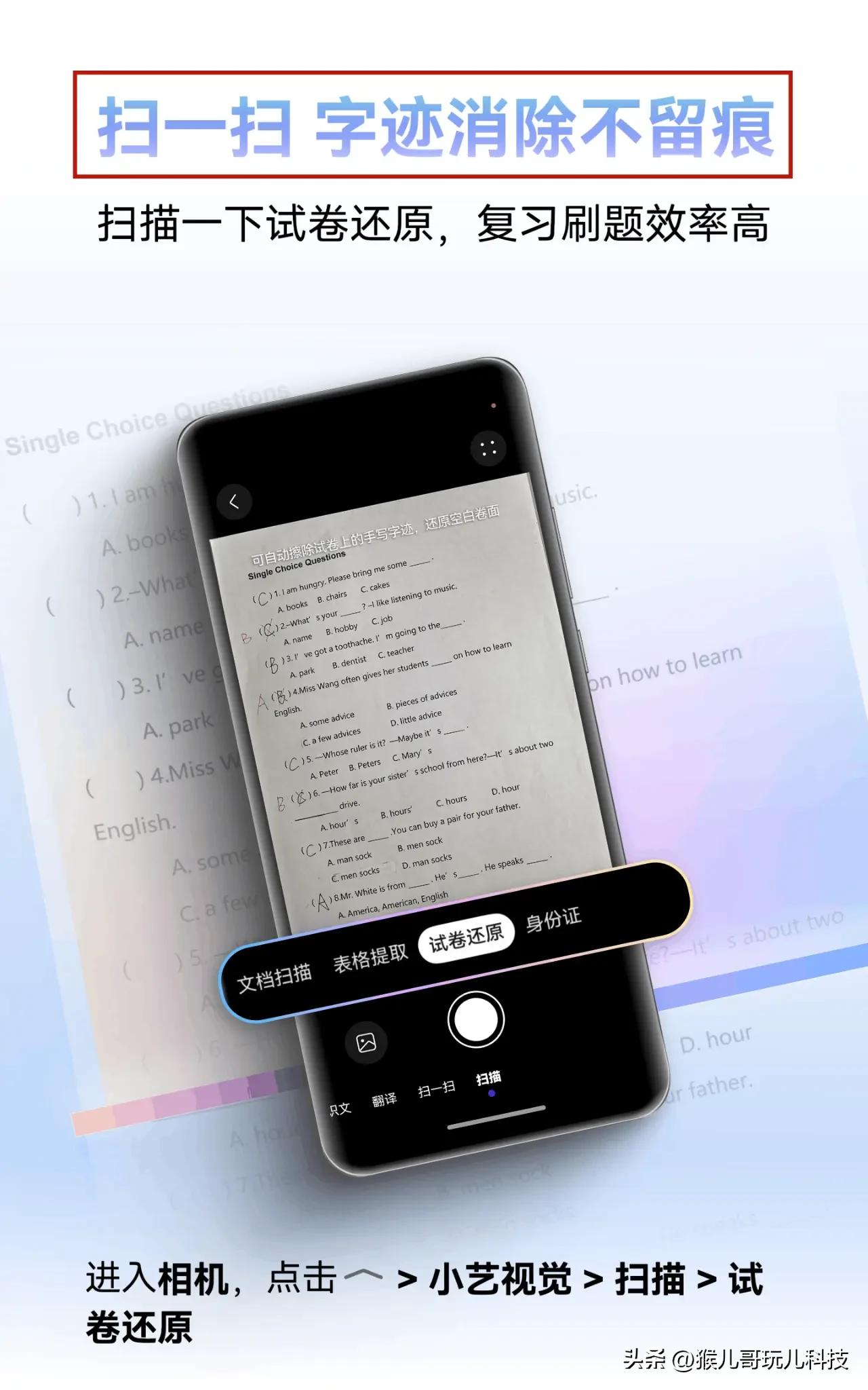 小艺的试卷还原功能就像变魔术一样登场了。只需要打开相机,点击"小艺视觉",选择"扫描"功能,再点击"试卷还原",对着你的试卷轻轻一扫,奇迹就发生了!原本写满答案的试卷瞬间变成了一张崭新的空白卷子。