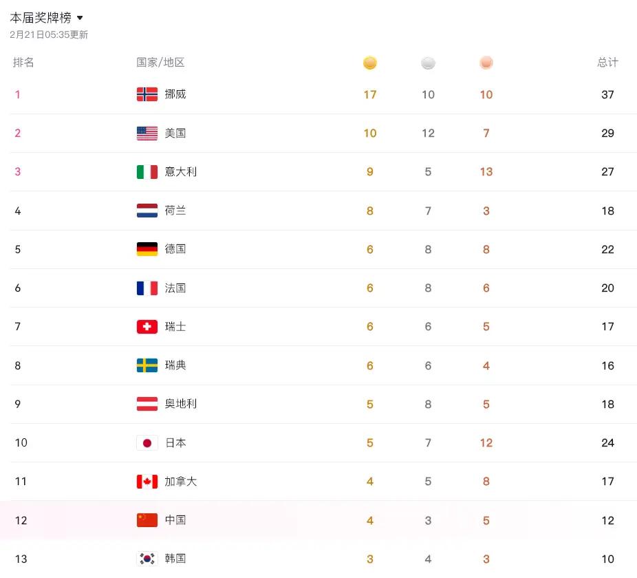 本届短道速滑奖牌榜格局清晰,荷兰队以5金1银1铜位居榜首,韩国队2金3银2铜紧随其后,加拿大、意大利分列三四位,中国队仅1银入账,位列榜单下游,彻底跌出短道速滑世界第一梯队。而在总奖牌榜上,挪威以17金10银10铜领跑,美国、意大利紧随其后,中国的12枚奖牌虽有亮点,却难掩短道速滑的尴尬。