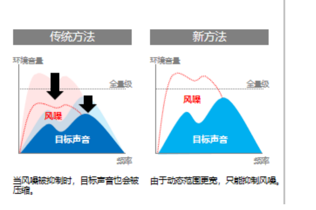 借助浮点录音技术,风噪消除系统在抑制风噪的同时不压缩目标声音,即使在强风环境下也能实现高音质效果。