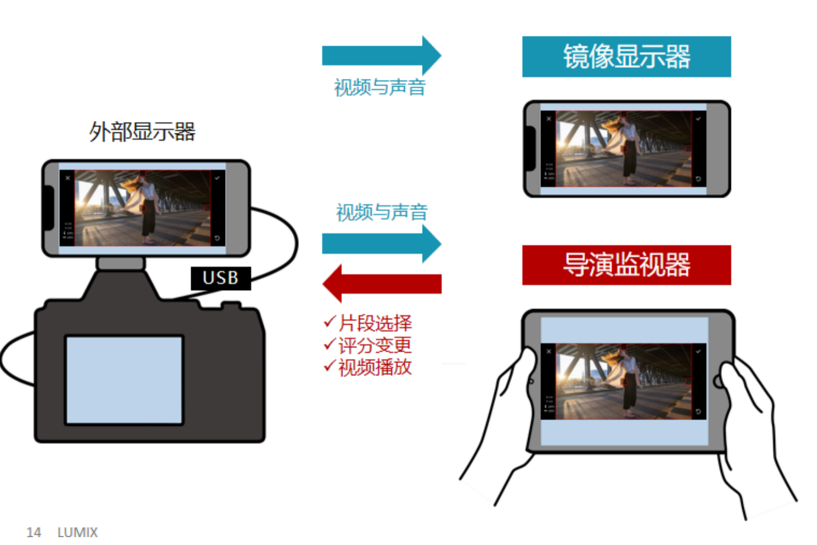 传统USB连接时音频由相机输出,现改为视频与音频均由智能手机播放