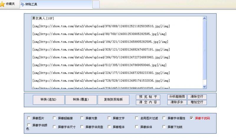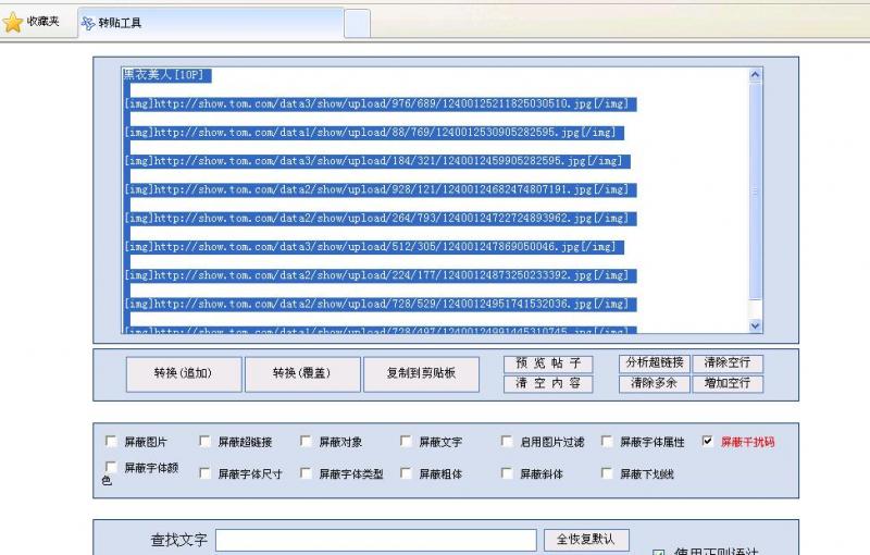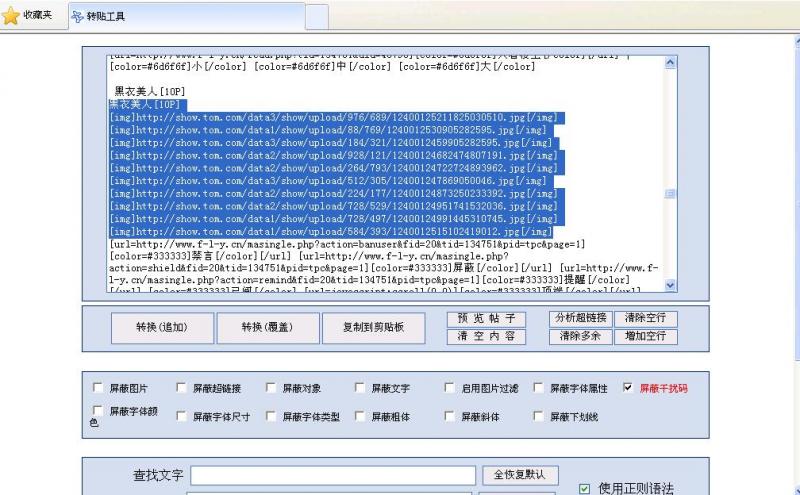 在转贴其它论坛上的帖子时,如果帖子中含有较多的图片及链接时,使用本转换工具可以方便地对原帖进行转换,转换为可以直接贴过来的代码。 2.打开在其他论坛或图站要转的帖子3. 选中全部要转贴的内容,包括文字、图片和链接等。按CTRL+C复制 或者点击右键点全选,看到全是高亮了吗!点击复制 4. 打开转帖工具,把刚才的内容粘贴到编辑栏!按一下本页面的“转换覆盖”按钮。转换后的代码即会出现在上面的文本框中。 其中图片变成了[*img]xxx...x[/img],网址链接变成了[*url]http://xxx...x[/url] 我们只需要找到[*img]xxx...x[/img]的代码! 找到图片帖子的代码,如图! 5.点击剪切,点击右下角的清空!在粘贴到编辑栏!自己编辑一下图片,在图片代码留上空格!这样图片中间有空格!图片还美观点! 6. 点击“复制到剪切板”,将文本框中的代码帖复制下来,用于发帖。