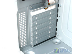 机箱设计有4个5.25英寸光驱位,2个软驱位以及5个硬盘位。不过由于前机箱面板上仅设有三个外露光驱位,因此最多只能安装3个光驱,另外一个可以安装一些扩展设备。并且在硬盘位下部还设有一个散热孔,利于增强硬盘区域的散热效果。