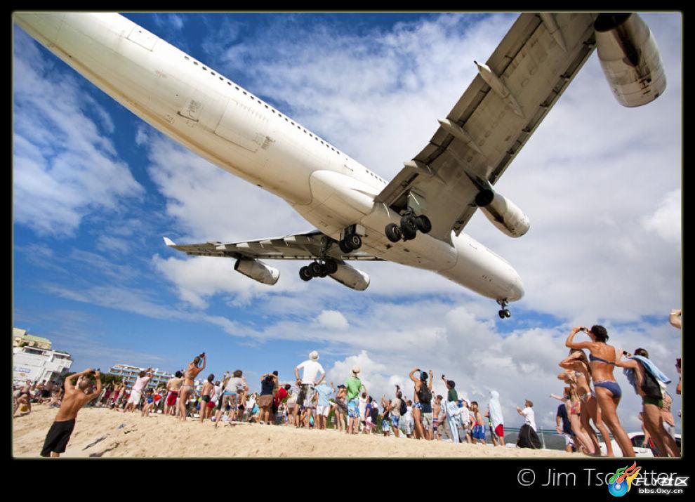 圣马丁岛的朱丽安公主机场是世界上起降点最低的机场,为了给大型喷气式客机留够足够的滑跑距离 机场跑道到旅游者聚集的沙滩只有15米的距离 作者 IC360