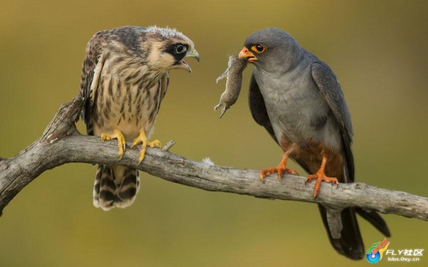 匈牙利赫特巴杰国家公园(Hortobagy National Park),一只雄性红脚隼(Falco vespertinus)把自己捕捉到的猎物递给雌性红脚隼。