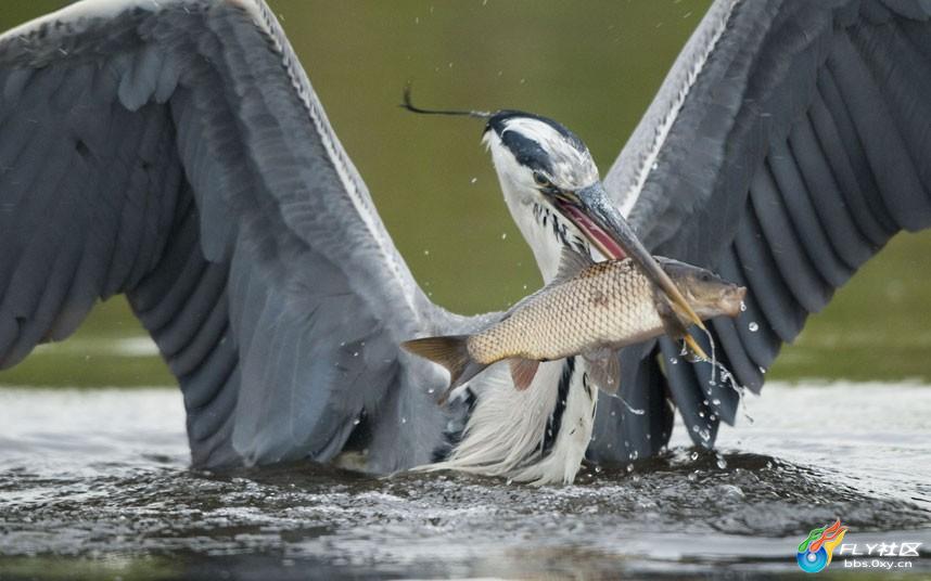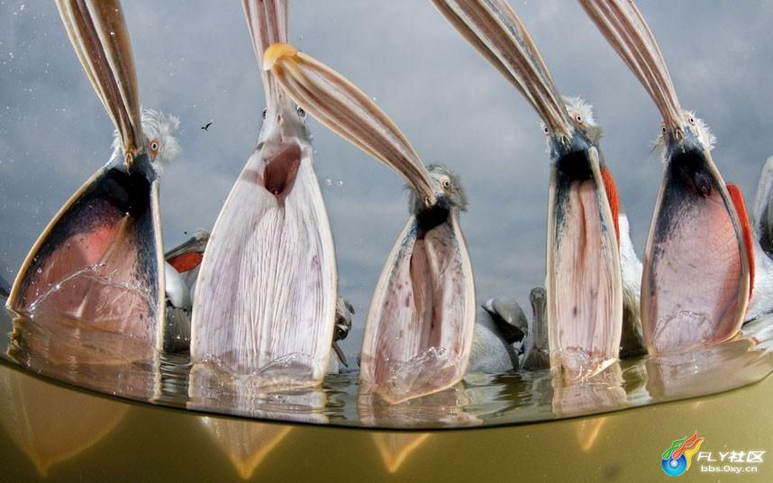 希腊科尔基尼湖,卷羽鹈鹕(Dalmatian Pelican)张开大嘴,正在水里捕食。这张照片在2011年年度野生生物摄影师奖(Wildlife Photographer of the Year)评选活动中得到了广泛赞誉。