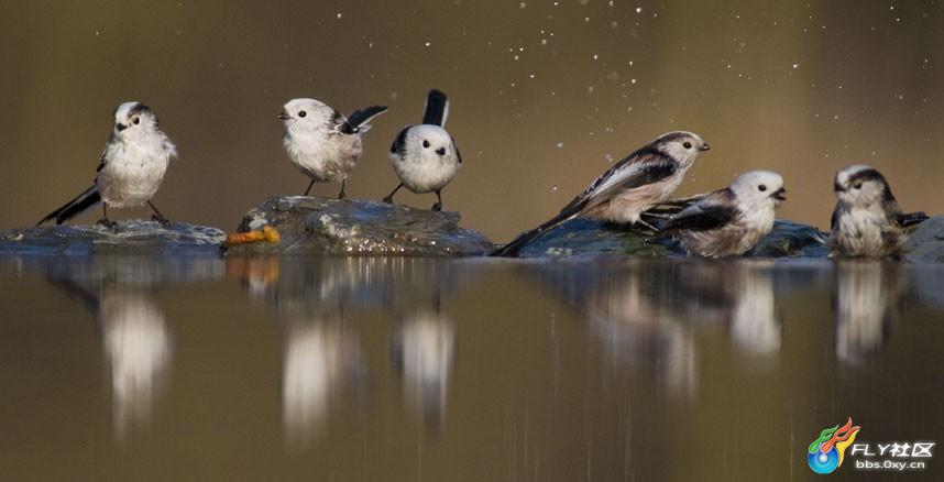匈牙利克斯甘萨格国家公园,一群银喉(长尾)山雀,站在水边,水中还能看到它们的倒影。