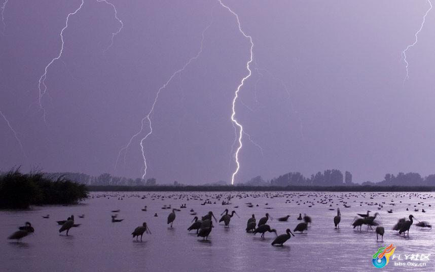 匈牙利克斯甘萨格国家公园克萨基湖,鹈鹕和其他鸟类挣在湖里觅食,天空中闪电密布。