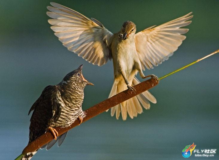 匈牙利普斯塔,一只杜鹃幼崽正向捕食归来的大苇莺索要食物。杜鹃最为人熟知的特性便是孵卵寄生,即产卵于某些种鸟的巢中,靠养父母孵化和育雏。