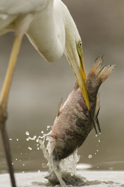 匈牙利克斯甘萨格国家公园克萨基湖,一只大白鹭从水里抓起一只鱼。