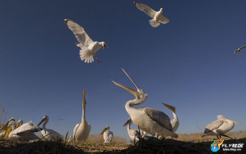 罗马尼亚多瑙河三角洲,卷羽鹈鹕(Pelecanus crispus)遭到海鸥的袭击。
