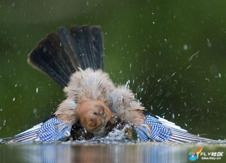 匈牙利克斯甘萨格国家公园,一只松鸦(Garrulus glandarius)将头埋入河中,冲洗自己。