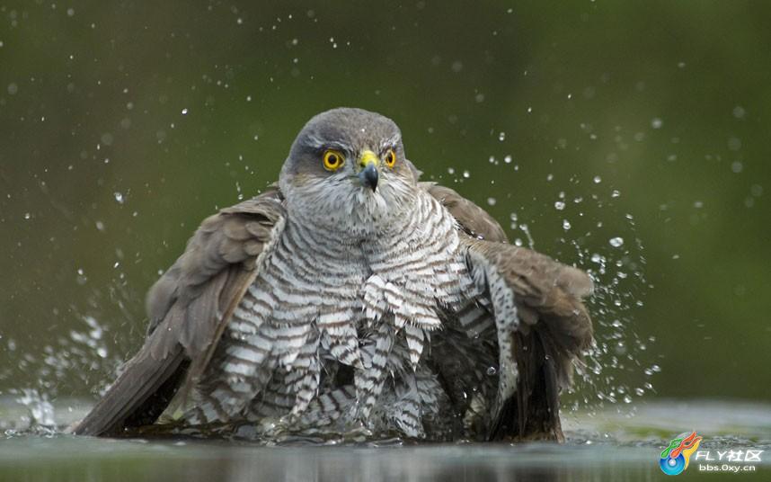 匈牙利克斯甘萨格国家公园,一只雌性雀鹰在水中梳洗。