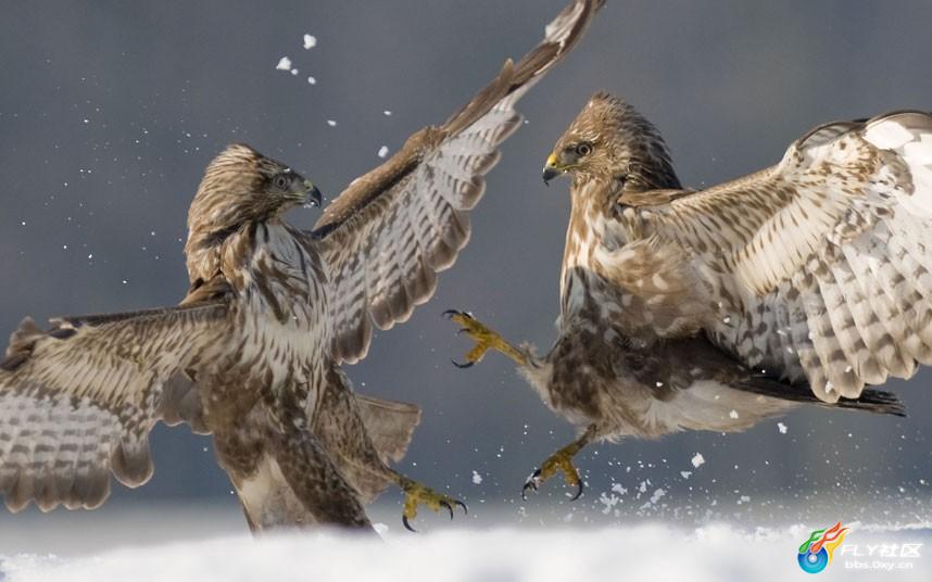 匈牙利克斯甘萨格国家公园,两只普通˙uteo buteo)在雪地里相互打斗。