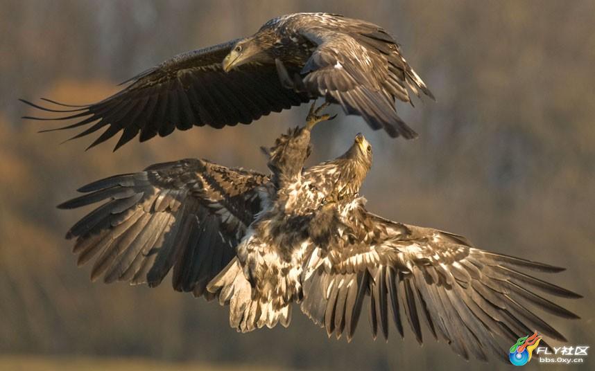 匈牙利赫特巴杰国家公园,两只白尾海雕在半空相互缠斗。