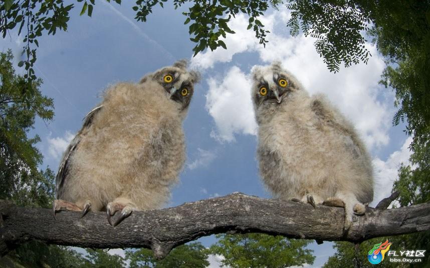 匈牙利克斯甘萨格国家公园,两只幼年长耳猫头鹰站在树干上。