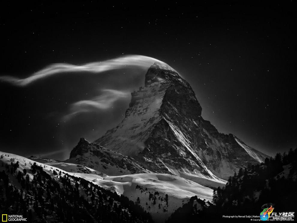 满月下云雾缭绕的马特宏峰--摄于瑞士采尔马特