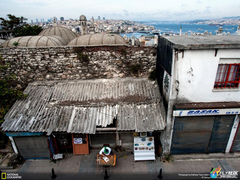 伊斯坦布尔的白与黑,双重视野下的伊斯坦布尔苏莱曼清真寺。画面的前景是一个在老城区破店前作画的年轻人,背景是繁华的“黄金角”。