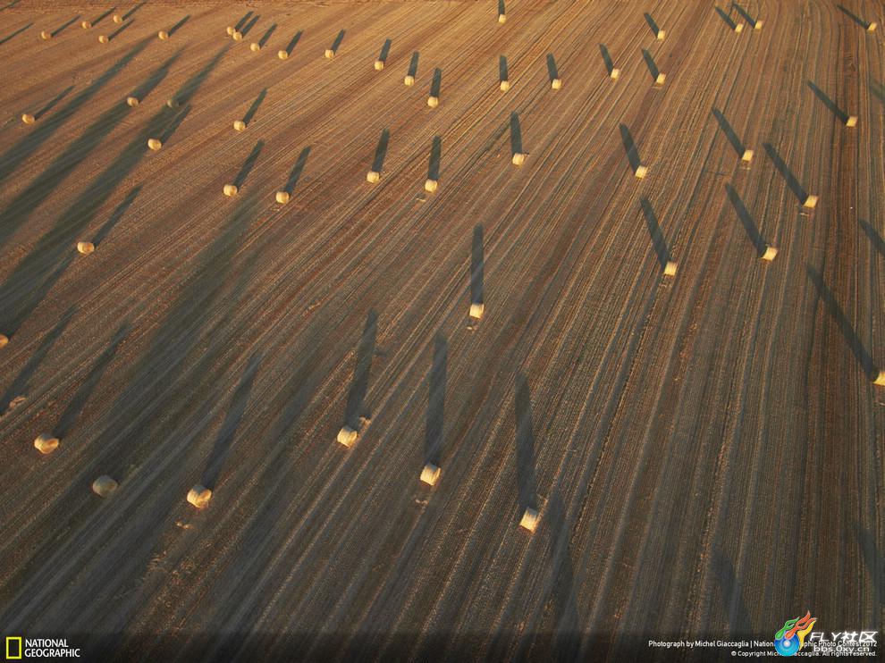 丰收后摆放在田野上的一垛垛秸秆,连着日落时候拖长影子,像夜空中的彗星一样 摄于意大利 安科纳 基亚拉瓦莱