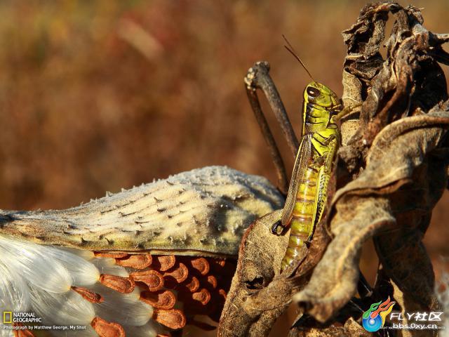 初秋的一个下午,美国威斯康星州的北方冰穴碛州立森林公园,一只大蝗虫趴在马利筋豆荚上。