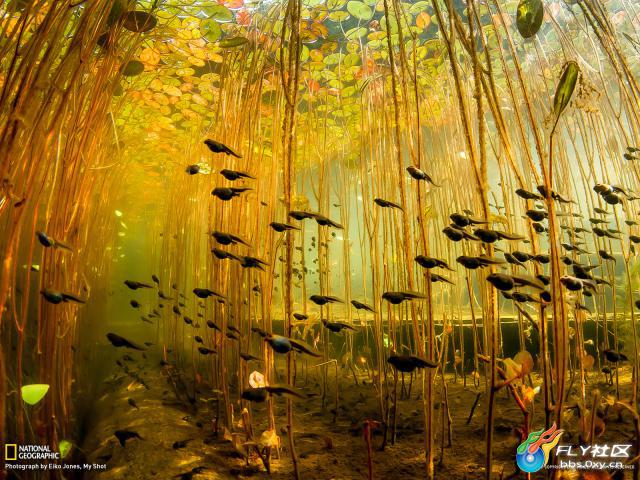加拿大温哥华岛的雪松湖,一群小蝌蚪在睡莲茎干丛中游动。