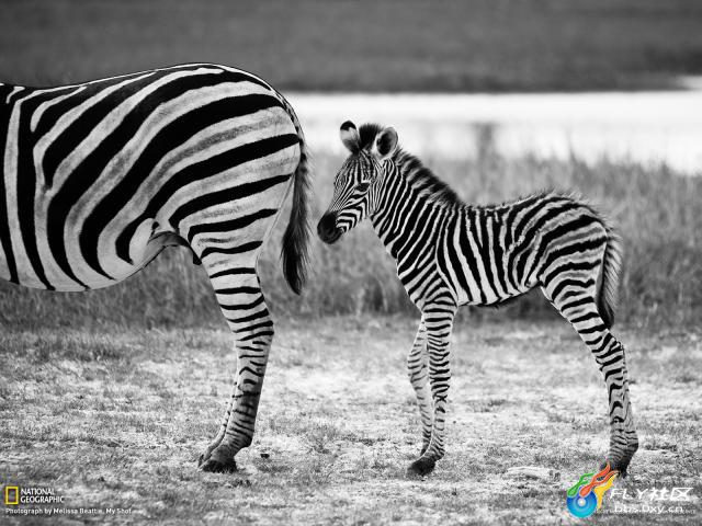 博茨瓦纳,一匹小斑马紧紧跟在一匹成年斑马后面。