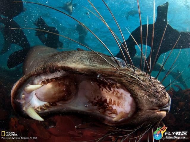 南非开普敦豪特湾的海豹岛,一只软皮海豹张开大嘴,露出尖尖的长牙。摄影师史蒂文-本杰明表示:“软皮海豹是我最喜欢拍摄的动物之一。它们好奇心很强,活泼好动,也因此很难拍摄。