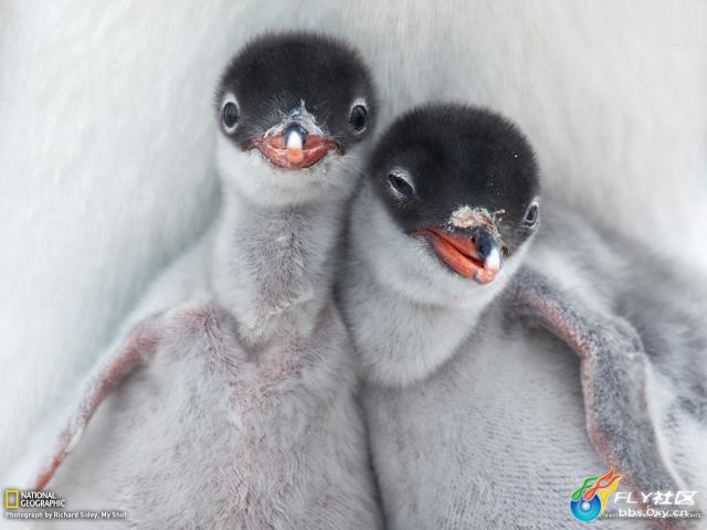 在南极洲拉可罗港,两只刚刚孵化出来的巴布亚企鹅幼仔好奇打量外面的世界,而它们的父母站在一旁。