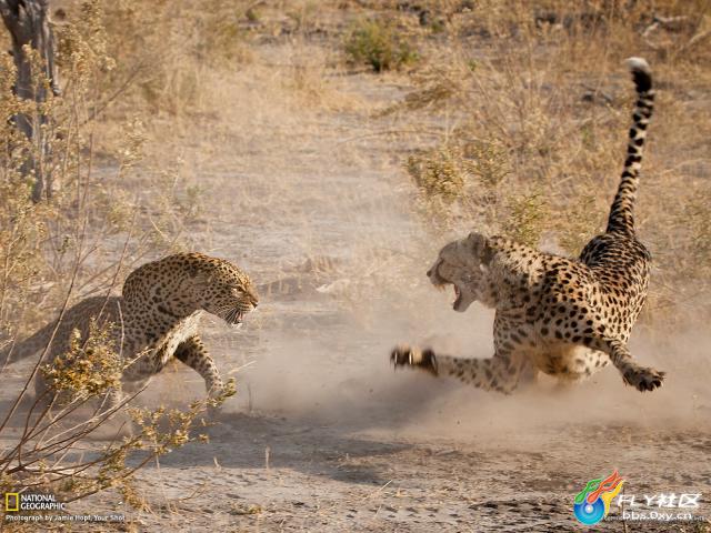 博茨瓦纳的一头公猎豹和一头母花豹,正展开搏杀。母花豹试图偷盗猎豹刚刚猎杀的猎物,但令人没有想到的是,猎豹居然展开还击,毕竟在捕食者的等级排序中,猎豹不及花豹。猎豹之所以大胆还击是因为太饿了,已经两天没吃东西。不幸的是,艰苦的努力有时得不到任何回报。这只猎豹就是如此,最后没能击败花豹。