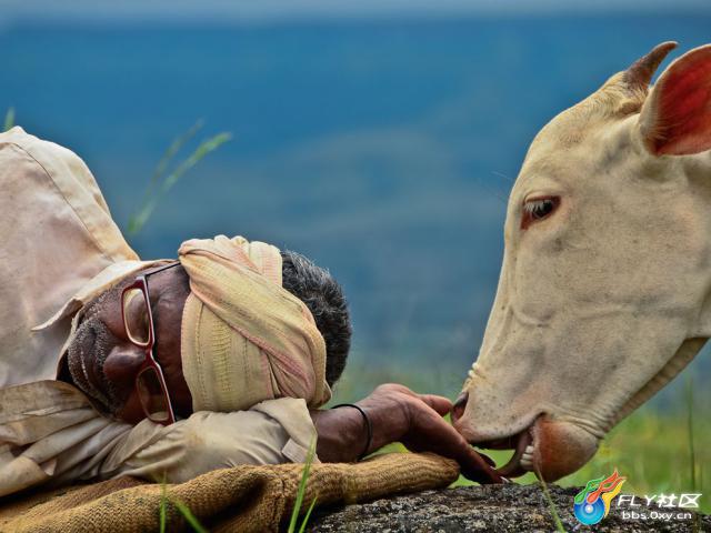 只有在农夫的身旁,小牛才感到安全和放松。当我在周围进行拍摄的时候,它察觉到我的存在,便慢慢走回农夫的身旁。