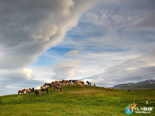 冰岛天空的云层延绵不绝,令人惊叹。云层下方,马群在悠闲地吃草,这一幕如同仙境。本图摄于冰岛北部一个名叫Ibisholl的育种场。