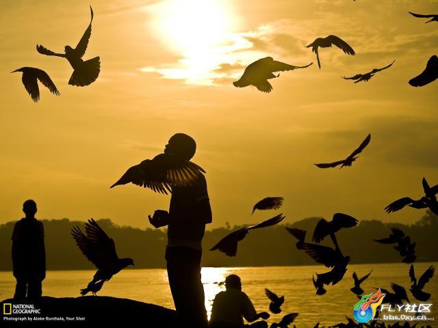 安达曼群岛的布莱尔港,鸽子和喂鸽子的居民在黎明阳光的映衬下显现出清晰的轮廓。这里的鸽子并不惧怕人类,居民每天喂给它们的谷物超过22磅(约合10公斤)。