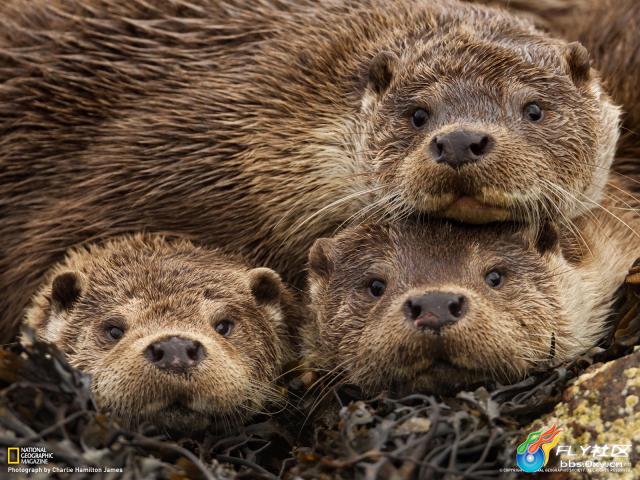 在苏格兰东部的设得兰群岛,河獭妈妈与它的两个孩子好奇地注视着摄影师的镜头。最近,右边的河獭幼仔遭遇一只螃蟹,结果鼻子受伤。成年河獭并不成双成对地生活在一起,雄性在抚养孩子方面不扮演任何角色。