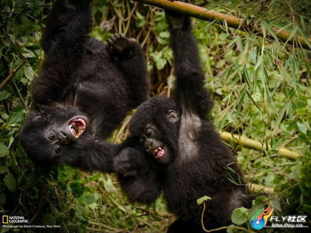 卢旺达火山国家公园的两只大猩猩幼仔,正在嬉戏打闹,玩得不亦乐乎。