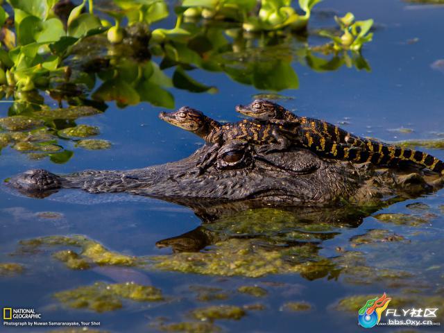 美国德克萨斯州的布拉索斯-班德州立公园,两只小鳄鱼趴在妈妈的脑袋上,看上去非常惬意。布拉索斯-班德公园生活着大量鳄鱼,也因此著称。