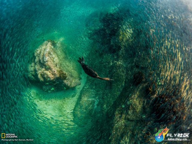 摄影师介绍说:“当我在墨西哥卡波圣卢卡斯附近的圣玛丽亚礁拍摄时,发现一只潜鸟在礁石中追赶一大群钓饵鱼。虽然这只鸟的速度很快,但我可以从上方拍到这张照片。”
