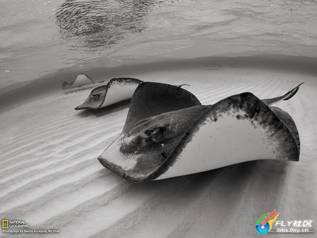 在大开曼岛的沙洲,黄貂鱼群排列成直线,优雅地“飞翔”。