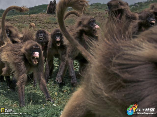 埃塞俄比亚高原,一群雄性狮尾狒狒对另一只雄性狮尾狒狒展开围攻。狮尾狒狒是一种高度群居的社会性动物,经常为获得雌性的垂青爆发争斗,有时会造成死伤。