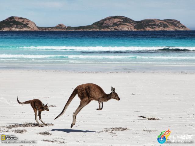 西澳大利亚埃斯佩兰斯的大角海滩,袋鼠妈妈正带着孩子“散步”。准确地说,应该是跳步。