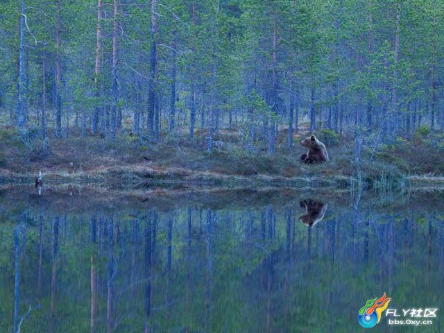 摄影师Sylwia Domaradzka花了16个小时的时间,终于在午夜等到了熊的出现。这是当天出现的唯一一头熊,露面之后又匆匆离开。图片摄于芬兰,熊的栖息地呈现出梦幻的色彩。