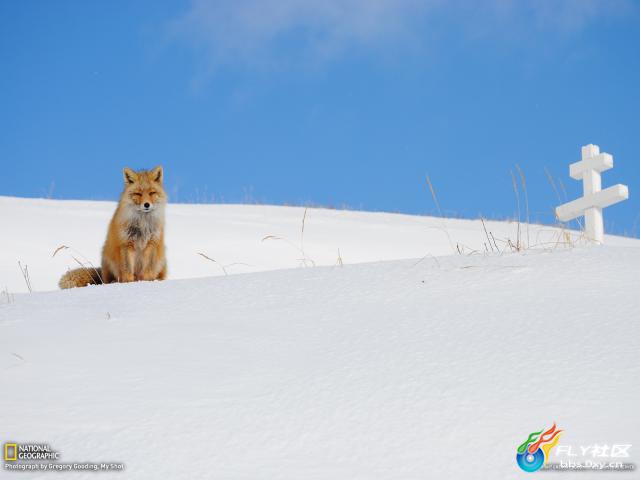 阿拉斯加的阿留申群岛,一只狐狸坐在荷兰港附近一个被雪覆盖的山丘上。