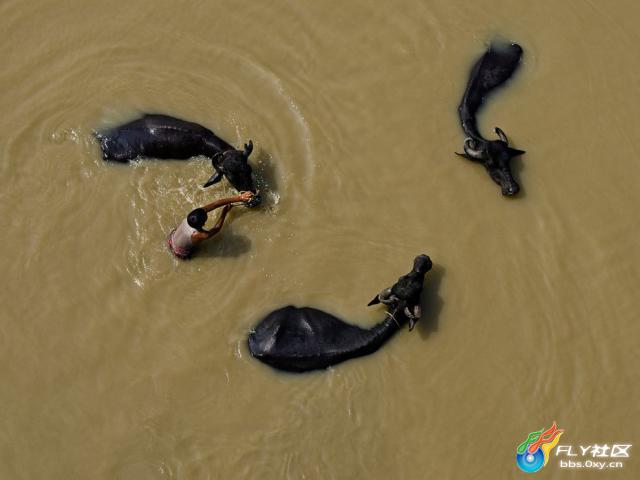 印度,一名小男孩正与3头水牛在水中嬉戏。