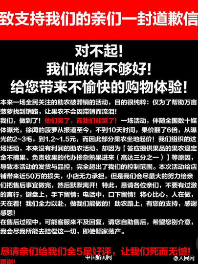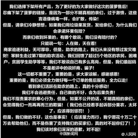 杨仕煌说,不管调查结果如何,都会当作教训,不过他们目前联系不上“笨鲜生”的负责人。“笨鲜生”在旺旺的自动回复中向买家道歉,解释说是物流环节的碰撞把果子压坏,并且表示会负责到底,每个坏菠萝赔5元。客服人员表示,不接受任何采访。而徐闻县的果农,也感到郁闷,就这样,农民没有摆脱亏损,还背上骂名;商家费了力又赔了本,还要善后;消费者收到的是烂菠萝--一件原本被称为“正能量”的事情,成了各方都受损的买卖