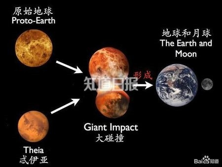 这个撞击非常的剧烈,并且,如果当初的撞击物更巨大,它可能会摧毁地球。地球的物质被撞入轨道中,并聚集形成了月球,它是太阳系中相对于其行星的最大的卫星。