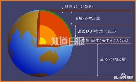 下地幔内延伸到地球的外核。地球外核是铁和镍的液体层,厚约2266公里,温度从4000摄氏度到5700摄氏度之间变动。