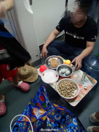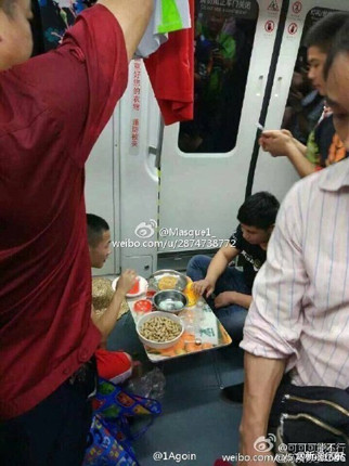 昨天,一张广州地铁的照片在微博被转发了4000多次。拥挤的车厢里,3位年约30岁的男子围坐一张折叠小桌,台面放着花生、咸蛋、馅饼,3人盘腿对饮,乐在其中,还用衣架晾着几件汗衫,就挂在扶手杆上。