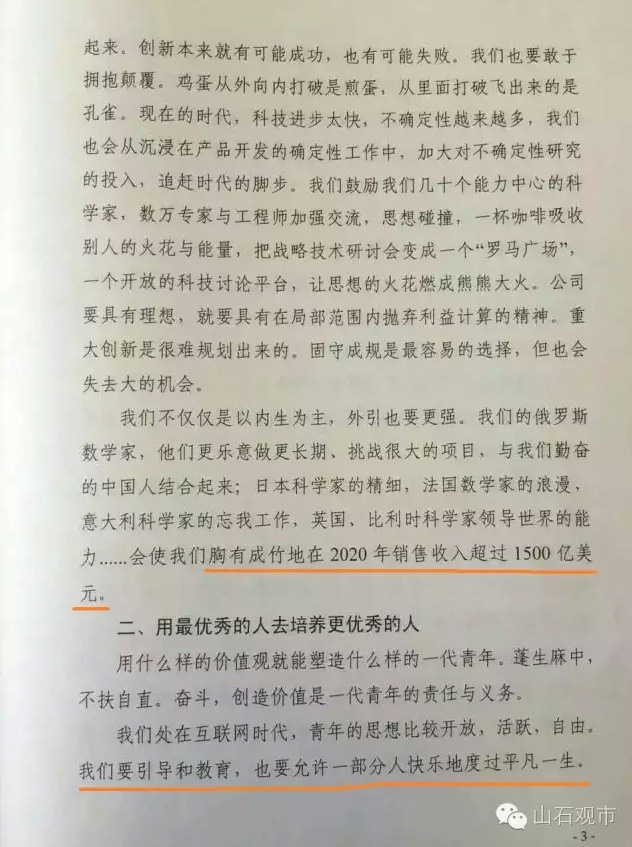 口说迷茫,任正非仍抛出一个雄心勃勃的目标:2020年销售收入要超过1500亿美元。也就是说,未来5年,华为的销售收入要突破1万亿人民币。