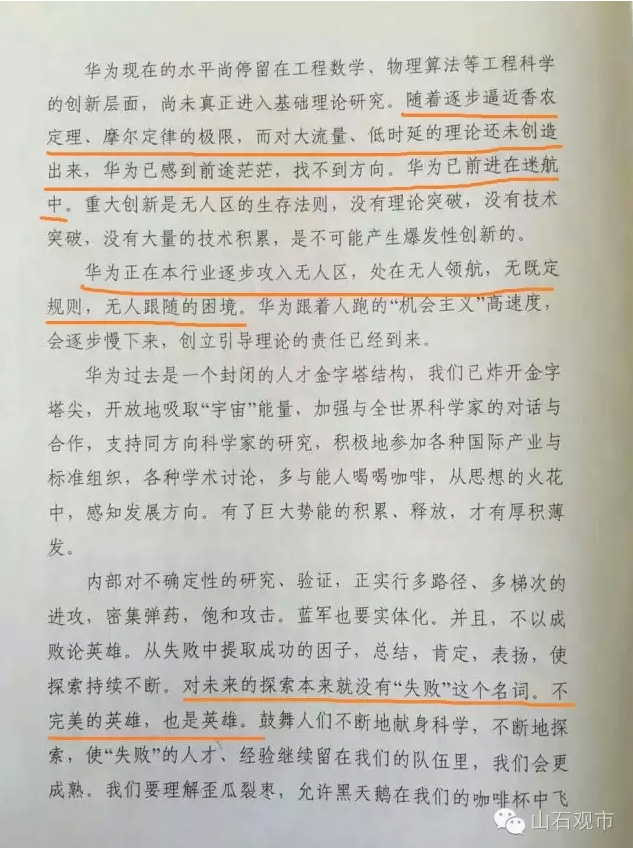 对现况,任正非直言不讳其迷茫,“华为现在的水平尚停留在工程数学、物理算法等工程科学的创新层面,尚未真正进入基础理论研究。随着逐步逼近香农定理、摩尔定律的极限,而对大流量、低时延的理论还未创造出来,华为已感到前途茫茫,找不到方向。华为已前进在迷航中。”