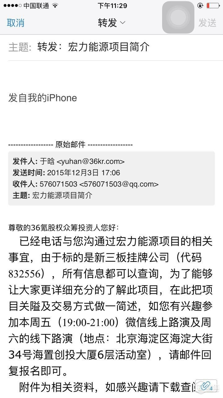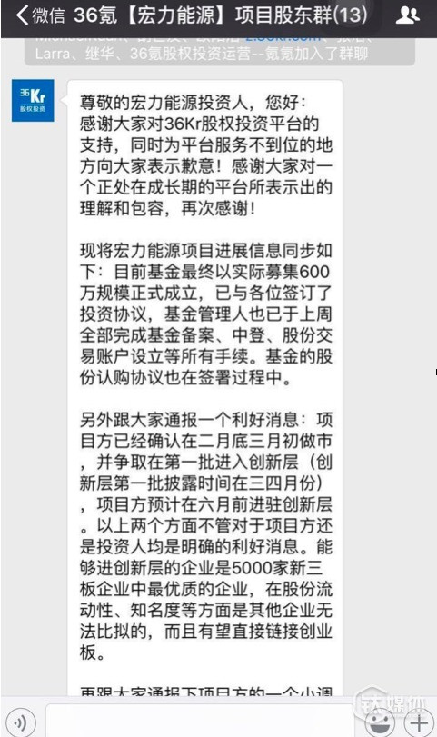 6月3日下午,国内知名股权众筹平台36Kr的一个核心投资人微信群中,数位投资超百万元的个人投资者,就36Kr平台的样板产品--新三板定增项目“宏力能源”投资欺诈事件,点名质问36Kr联席CEO魏珂与刘成城。引发该群内外众多其他项目的股权投资者的更多讨论和强烈响应,言辞也颇为激烈。