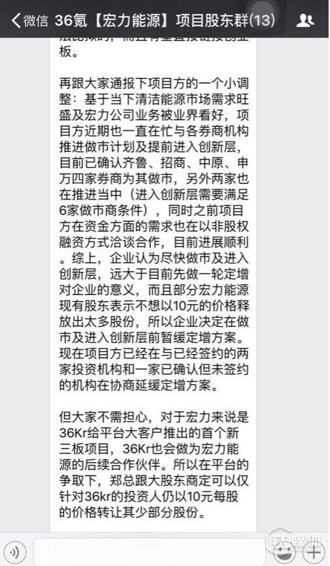 36Kr工作人员在宏力投资人微信群中解释,宏力能源希望优先把进入“创新层”的事情做好,对自身业绩非常有信心,而大量做10块钱的定向增发会稀释太多股份。因此暂时放弃做定向增发的选项。在36Kr方面表示,工作人员通过找内部关系,说了很多好话才争取到宏力能源老股转让的机会。