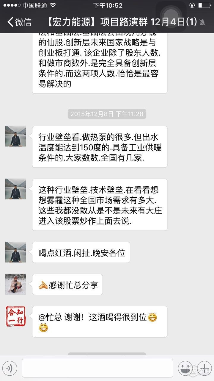 除了帮助项目做了上述一系列不符合事实的包装,在36Kr承接的宏力能源路演群里,顾伟认为有大量的“托”在怂恿投资人认购平台推荐的项目。其中一位微信名为“忙总”的“投资人”在路演群中极为活跃热心。从顾伟提供的路演群聊截图上看,“忙总”频繁地答疑其余投资人对项目前景和投资操作流程的种种疑问。从其留言中不难看出他对宏力项目的看好;例如“忙总”认为在行业技术壁垒上,“能达到宏力水准的公司全国屈指可数,可以想象全国市场需求有多大。”